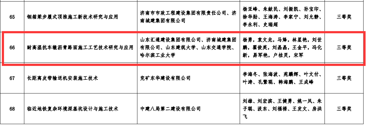 近日,山東匯通建設(shè)集團(tuán)有限公司工程管理部根據(jù)濟(jì)南土木建筑學(xué)會(huì)轉(zhuǎn)發(fā)的《推薦2021年度“山東土木建筑科學(xué)技術(shù)獎(jiǎng)”》的通知要求和評(píng)審辦法積極組織申報(bào)建設(shè)科技創(chuàng)新成果獎(jiǎng)。公司申報(bào)的3項(xiàng)課題全部獲獎(jiǎng),其中“低溫期瀝青路面施工工藝技術(shù)研究與應(yīng)用”項(xiàng)目獲二等獎(jiǎng),“耐高溫抗車轍瀝青路面施工工藝技術(shù)研究與應(yīng)用”項(xiàng)目獲三等獎(jiǎng),“道路基層多功能砼側(cè)模施工工藝技術(shù)研究與應(yīng)用”項(xiàng)目獲三等獎(jiǎng)。三個(gè)項(xiàng)目經(jīng)專家評(píng)價(jià)總體達(dá)到國家先進(jìn)水平。